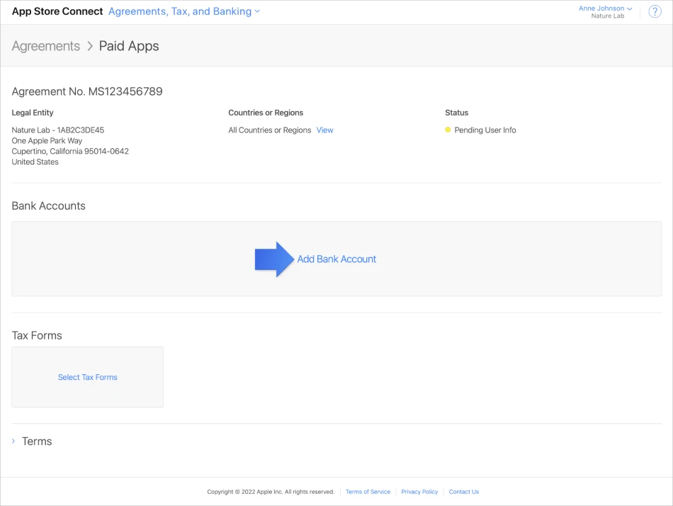 This will take you to the paid apps agreement page; click on Add Bank Account and enter your information.