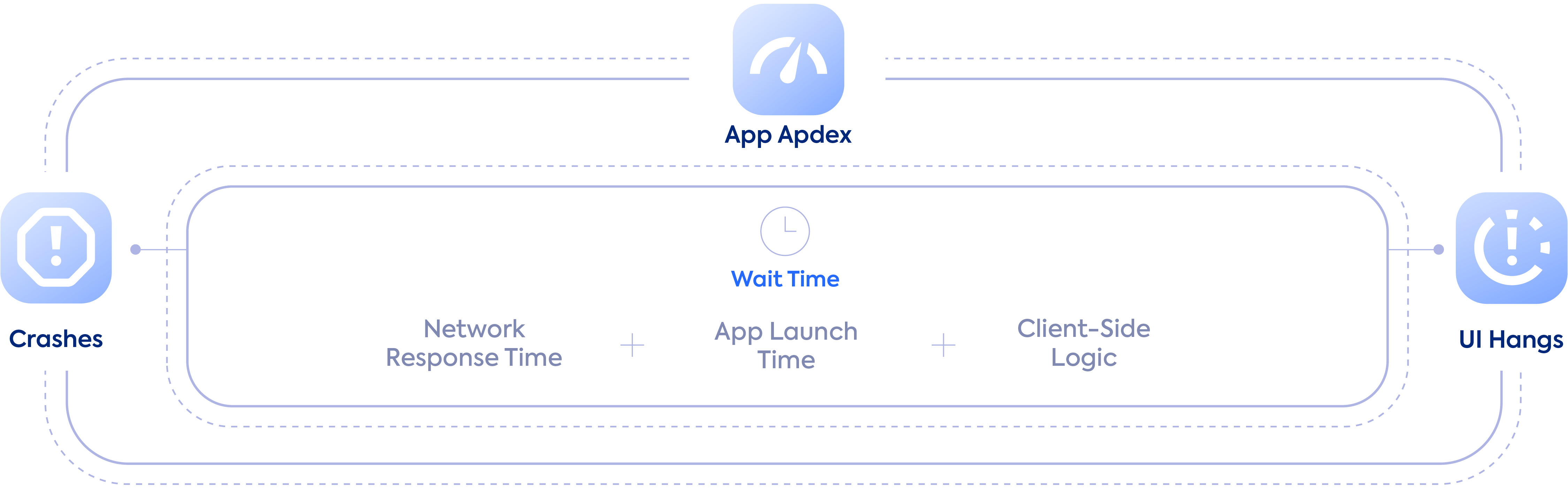 Apdex aggregates individual performance metrics and events to quantify the user experience on a scale of 0 to 1, with a score of 1 awarded to perfect performance. It’s calculated by tracking metrics such as UI hangs, crashes, network calls, app launches, and app traces. These metrics are further used to group user sessions into: