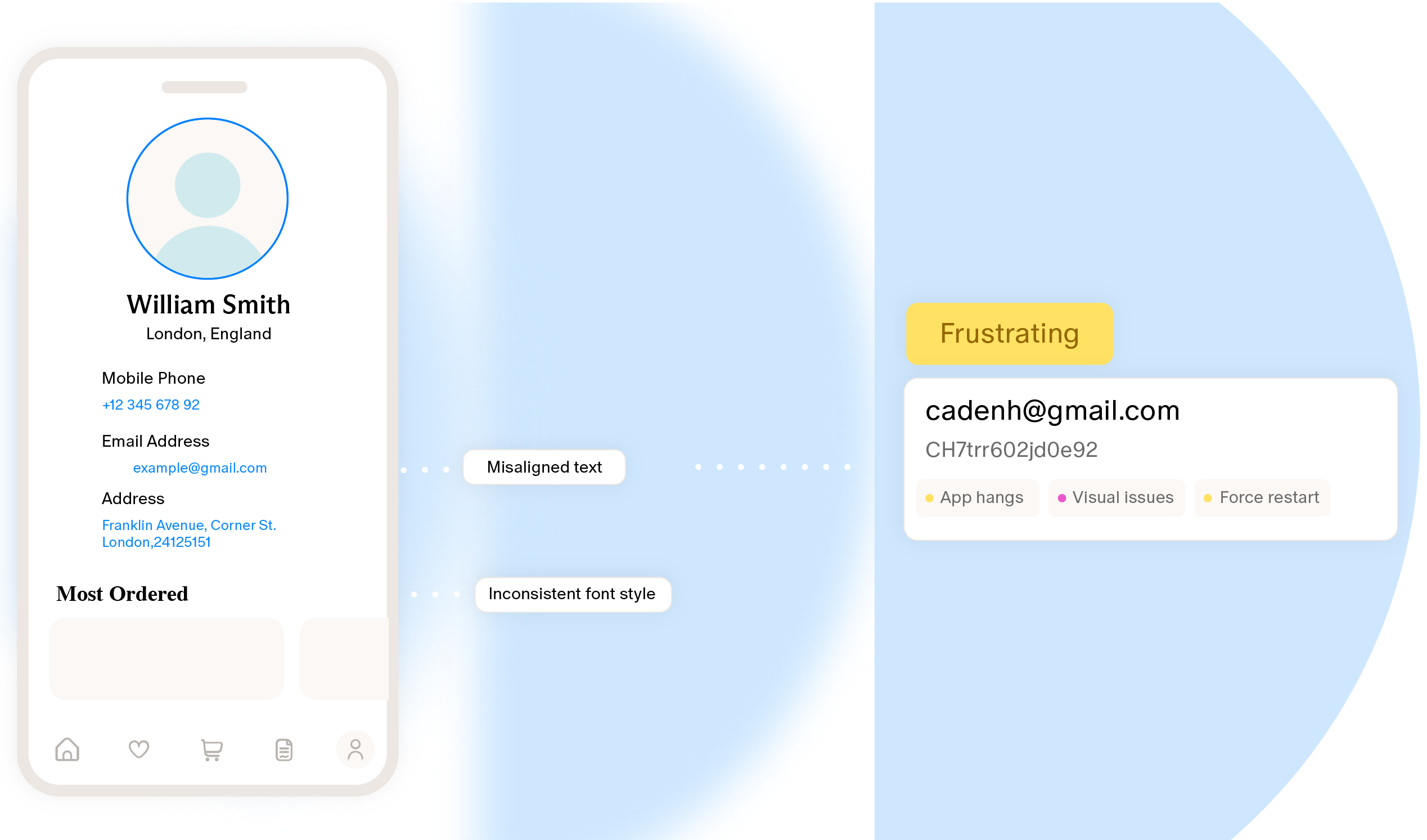 Capture technical and visual issues directly from user devices. Automatically identify friction like frozen frames and non-deterministic broken functionality. Get the high-fidelity signal to solve challenging issues.